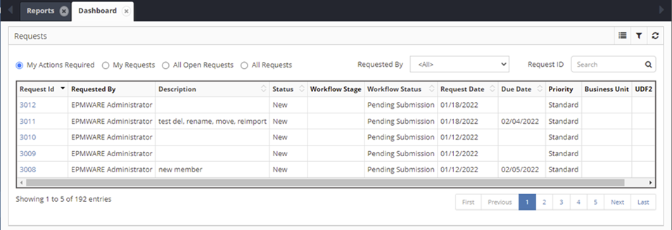 The top of the Dashboard page lists all Requests or specific requests that are awaiting actions by selecting one of the radio button filters. Or the user can select Advanced Filter to perform a more specific search.